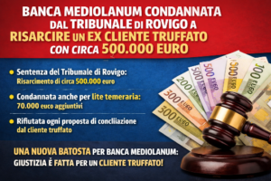 Dopo molti anni dall’esplodere della vicenda legata al promotore finanziario di Banca Mediolanum, Raffaele Mazzoni, già condannato con sentenza definitiva dopo tre gradi di giudizio, un altro cliente associato Codacons ha finalmente ottenuto giustizia. Il cliente, che non ha accettato di rinunciare a parte del risarcimento spettante, ha visto riconosciute le proprie ragioni dal Tribunale […]